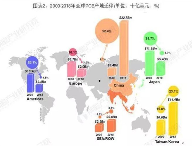 PCB產業在世界范圍內廣泛分布,歐美發達國家起步早,研發并充分利用先進的技術設備,故PCB行業得到了長足發展。近二十余年,憑借亞洲尤其是中國在勞動力、資源、政策、產業聚集等方面的優勢,全球電子制造業產能向中國、中國臺灣和韓國等亞洲地區進行轉移。