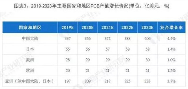 據Prismark預測,未來5年亞洲將繼續主導全球PCB市場的發展,而中國的核心地位更加穩固,中國大陸地區PCB行業將保持4.4%的復合增長率,至2023年行業總產值將達到405.56億美元。在PCB公司"大型化、集中化"趨勢下,已較早確立領先優勢的大型PCB公司將在未來全球市場競爭中取得較大優勢。