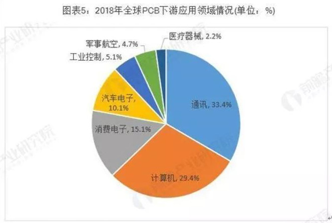 電子信息產業的蓬勃發展是PCB行業發展的重要助力。從下游應用領域分布來看,2018年通訊行業的PCB市場規模最大,占比約為33.4%;其次是計算機行業,占比約為29.4%。其他領域PCB市場規模較大的是消費電子、汽車電子。