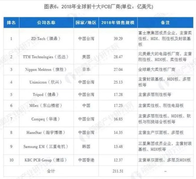 全球印刷電路板行業集中度不高,生產商眾多,市場競爭充分。雖然目前PCB行業存在向優勢企業集中的發展趨勢,但在未來較長時期內仍將保持較為分散的行業競爭格局。根據N.T.Information發布的2018年世界百強PCB企業排行榜,2018年前十大PCB廠商收入合計為211.51億美元。2018年全球前十大PCB廠商的銷售情況如下: