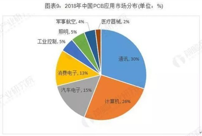 全球PCB下游應用市場分布廣泛,主要包括通訊、計算機、消費電子、汽車電子、工業控制、軍事航空、醫療器械等領域。根據Prismark的統計,2018年全球PCB下游應用領域分布如下: