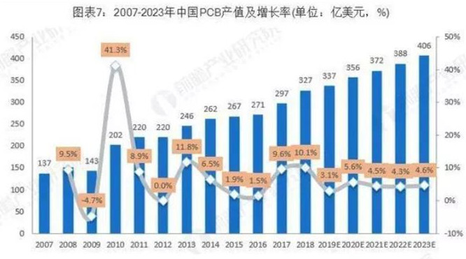 在當前全球經濟復蘇的大環境下,通訊電子行業、消費電子行業需求相對穩定,同時汽車電子、醫療器械等下游市場的新增需求逐年上升。根據Prismark預測,未來五年全球PCB行業產值將持續穩定增長,預計2018年至2023年復合增長率為3.7%,2023年全球PCB行業產值將達到747.56億美元。